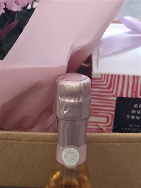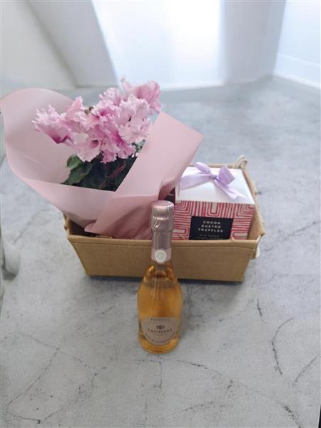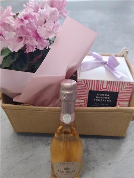 A stylish and indulgent gift basket featuring a stunning pink flowering cyclamen plant wrapped in pastel paper, a delicious box of cocoa dusted truffles, and a mini bottle of Prosecco for a sparkling touch.