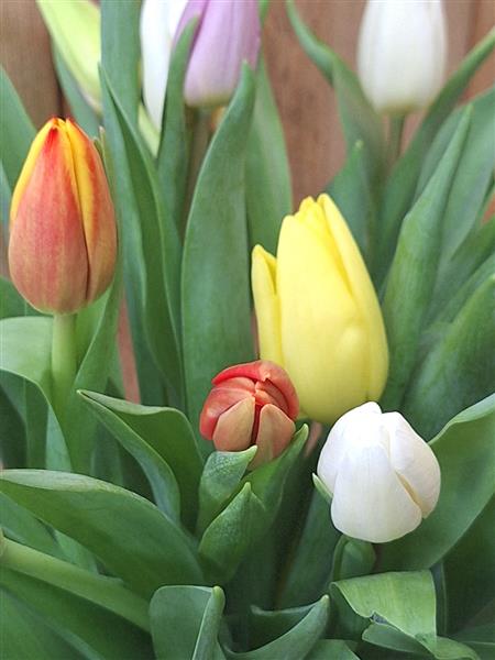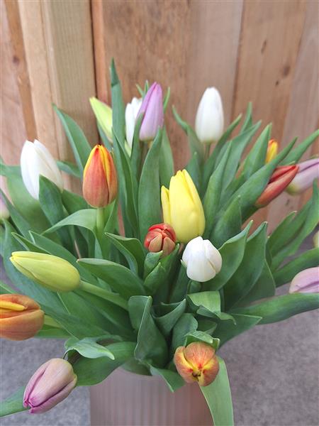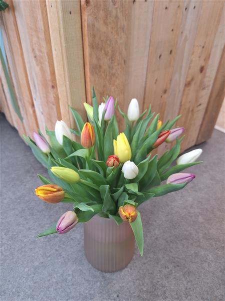Gorgeous mixed tulips presented in a blush pink vase.